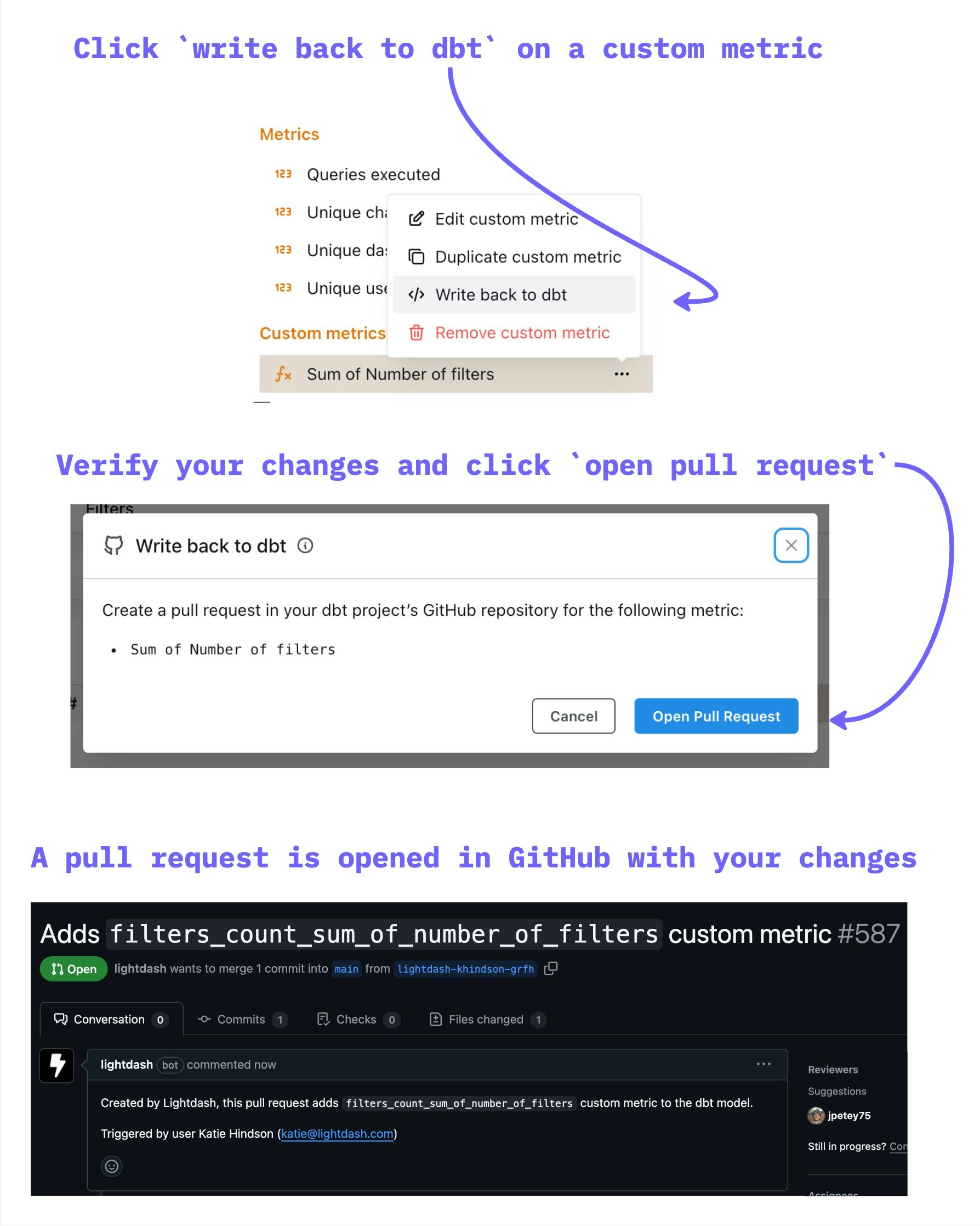 Open pull request will open a pull request created by Lightdash against your dbt project in GitHub or GitLab.