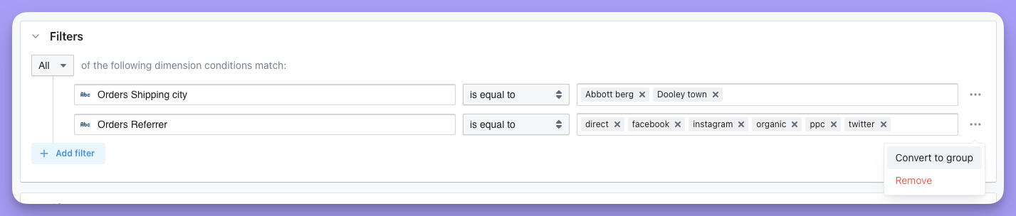 Here are some general tips about filters that apply to using them in both the Explore view and in dashboards.If you want to have multiple filters, just click + Add filter